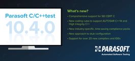 Das neue Release 10.4.2 von Parasoft C/C++test, der einheitlichen C/C++-Entwicklungstest-Lösung für Embedded-Anwendungen, bietet Support für Codierstandards MISRA, CERT C/C++, ISO 26262, DO-178B/C, IEC 61508, IEC 62304, AUTOSAR und nun auch AUTOSAR C++.